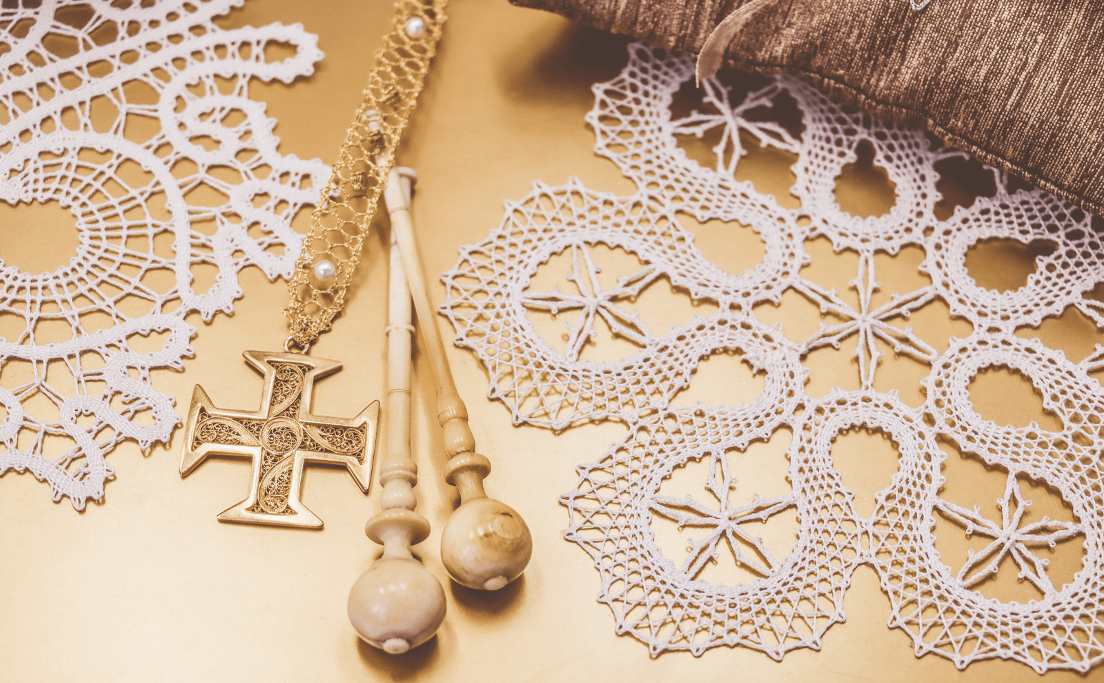 Recently, Céu Salazar completed her favourite piece, a tablecloth that is one of the most beautiful and largest laces she has ever made. This work, imbued with the aura of ancient times, presents a complexity that few lacemakers would dare to tackle. Being a large project, which involved high costs and a long execution period, Céu shared the responsibilities with other experienced lacemakers. This decision facilitated the management of the work and strengthened the exchange of knowledge among the artisans, ensuring respect for traditional methods. Céu Salazar's awareness of the importance of collaborative work comes from her experience with a lineage of lace masters who did not work alone and from the understanding that a single bobbin does not weave lace, just as a single artisan does not sustain a tradition. This distinctive vision allows Céu to dedicate time to developing other innovative products that combine the delicacy of lace with the robustness of materials like silver and gold; creating decorative elements for interiors, such as sofas and lamps; and making smaller, more marketable pieces, such as bracelets, earrings, or book markers. The nativity scenes made of lace are one of the hallmarks of Céu Salazar's work. Her creation was based on moulds from Eastern Europe, fully adapted to incorporate traditional lace techniques. To form the bodies of the characters, Céu uses the bobbin as a central structural element. The figures are finished with complex interweavings, giving them volume and detail, transforming simple threads into distinct three-dimensional contours. With innovative techniques, Céu has revitalised the application of lace in unconventional formats.